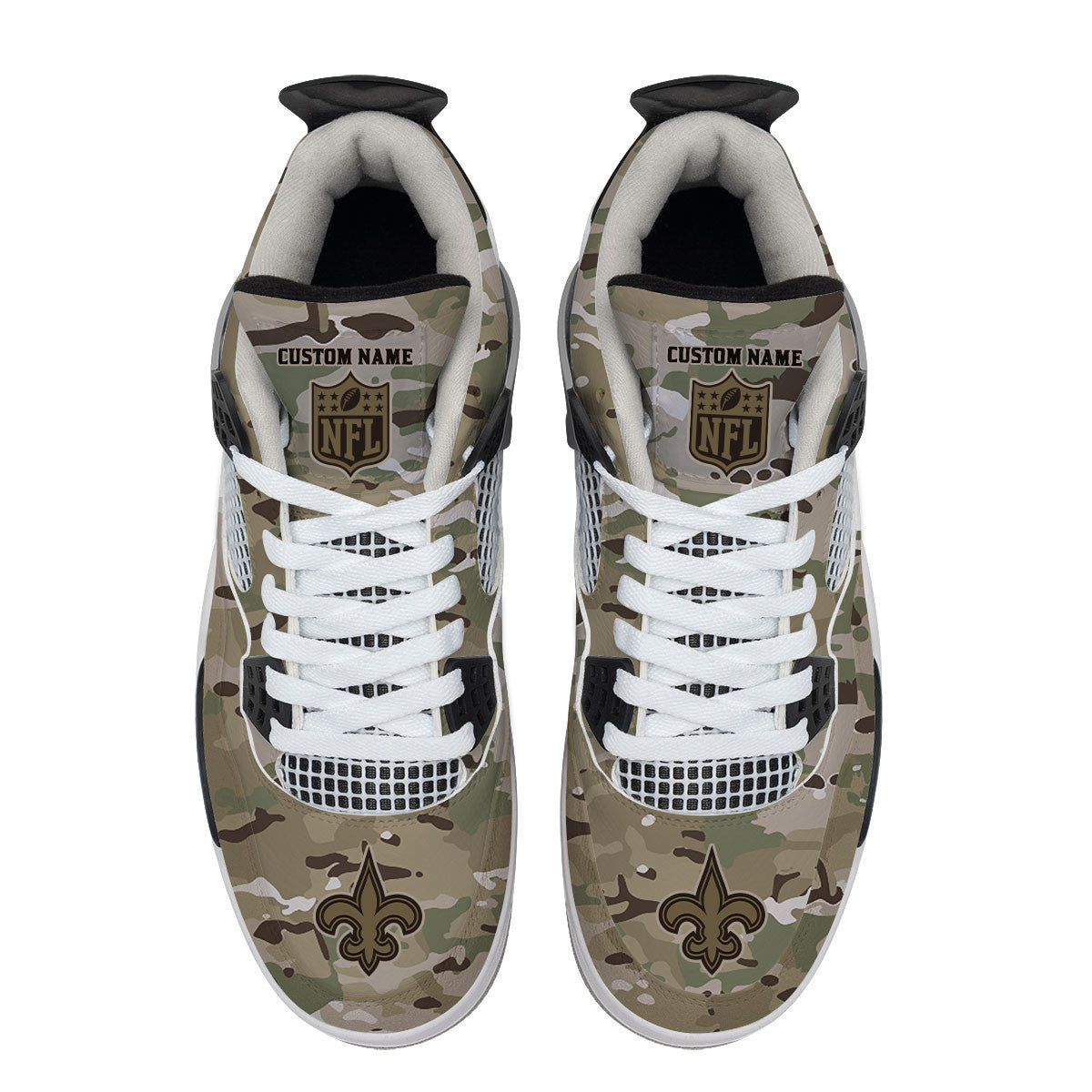 Shop the Unique New Orleans Saints Camo Personalized AJ4 Sneakers BG15