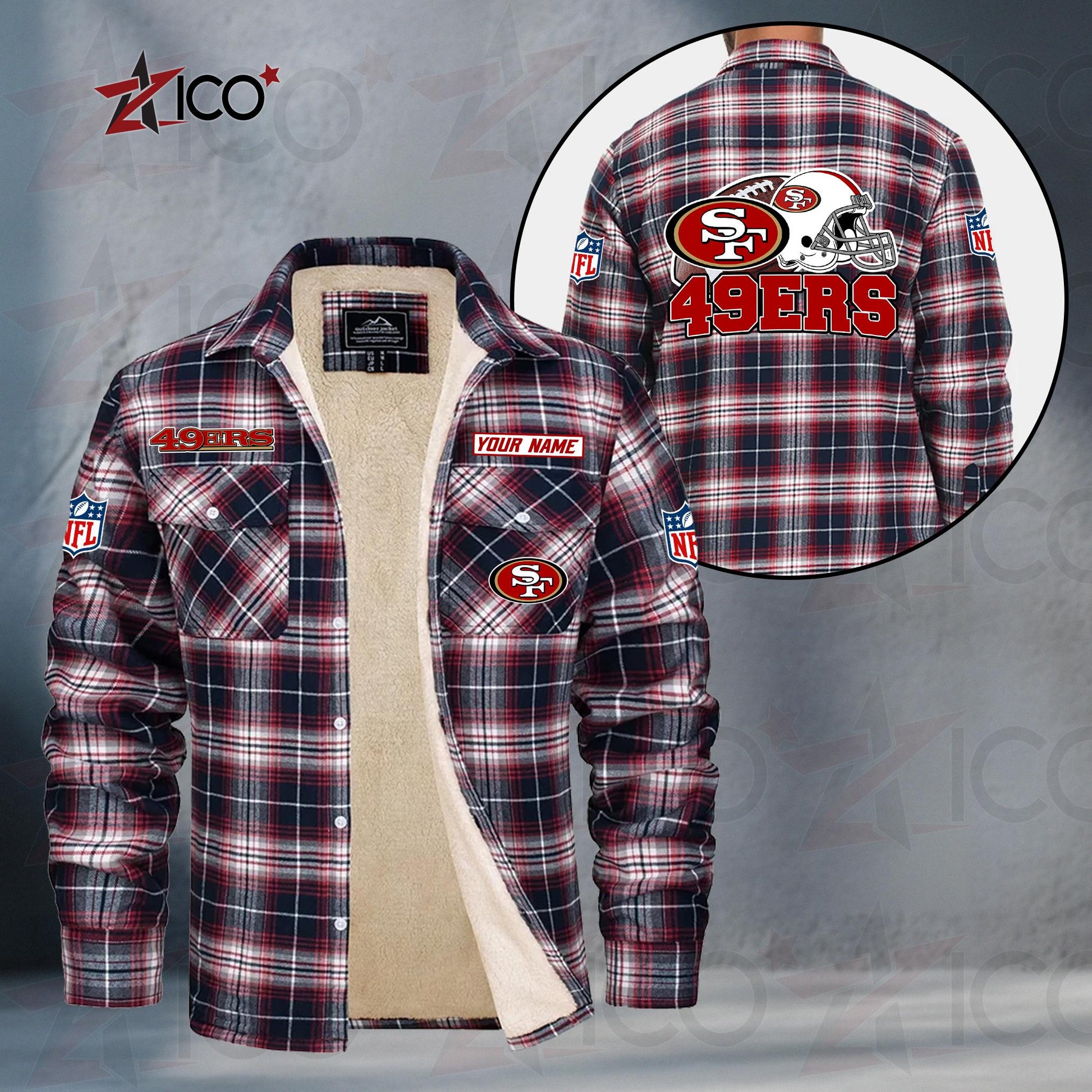 The durable flannel exterior blocks out the chill, while the ultra-soft sherpa-style lining keeps you warm from kickoff to the final whistle. Featuring bold NFL-inspired team graphics and an optional custom name or player number, this jacket is the perfect mix of comfort, spirit, and individuality.